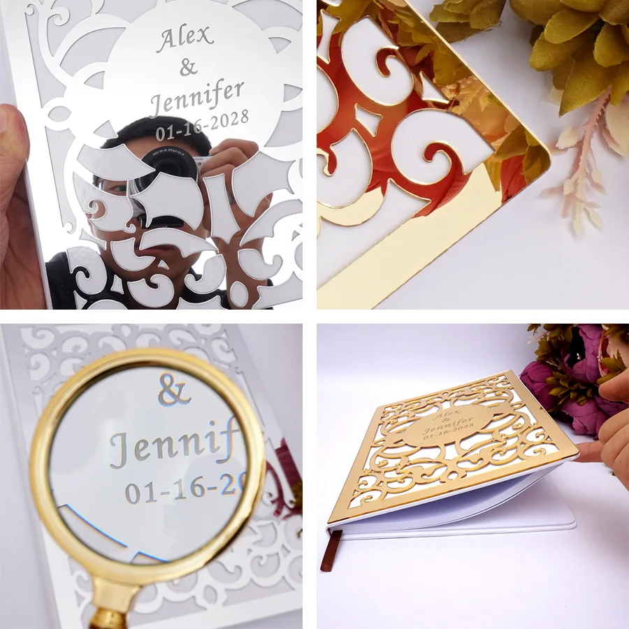 26x19cm Personalized Vertical Style Engrave Bride & Groom Name Wedding Book Acrylic Mirror Cover Hollow Out Design Guestbook